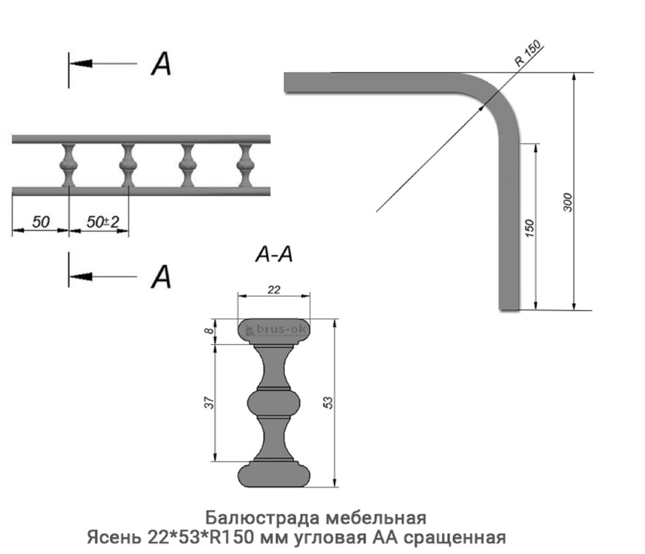 Балюстрада мебельная Ясень АА сращенная / угловая (22 * 53 * R150 мм)