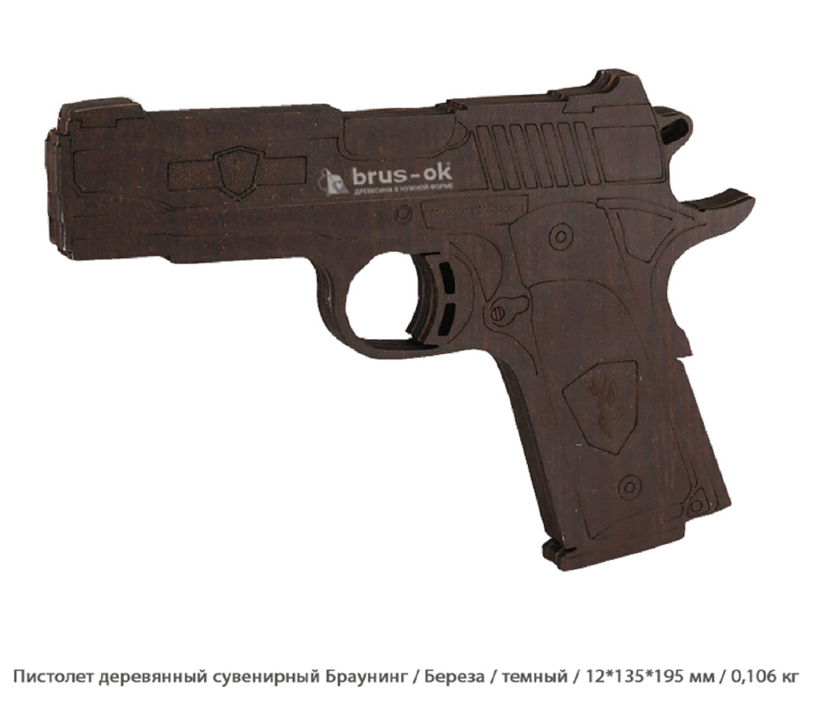 Пистолет деревянный сувенирный Браунинг Береза / темный / 12 * 135 * 195 мм / 0,106 кг (0,106 кг / 12 * 135 * 195 мм)