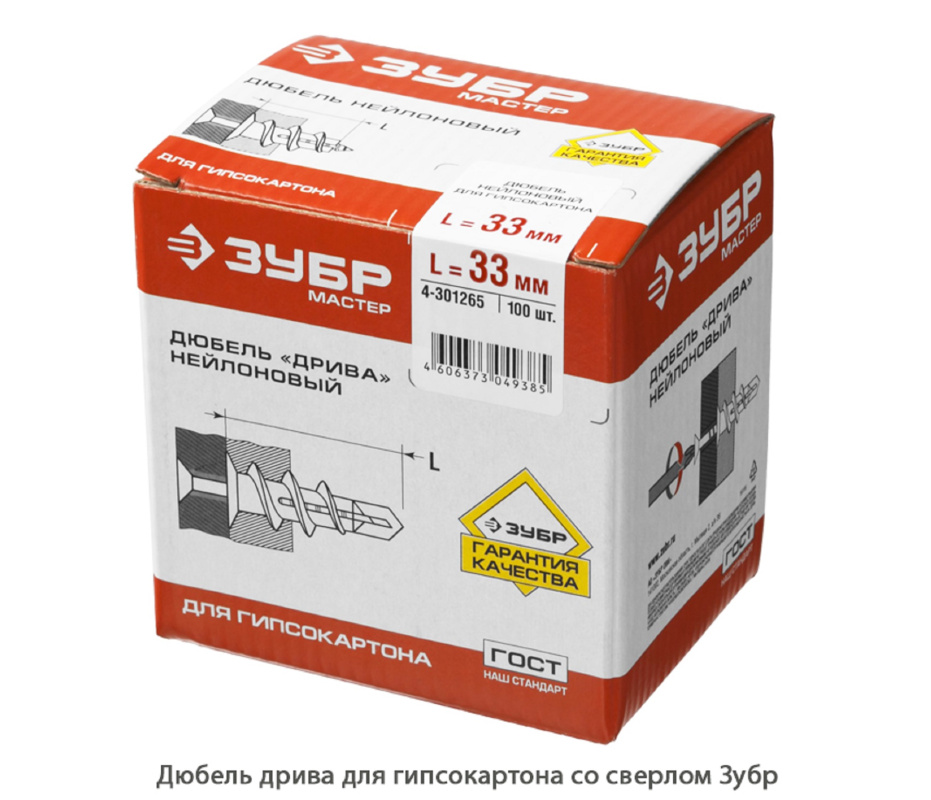 Дюбель дрива для гипсокартона со сверлом Зубр