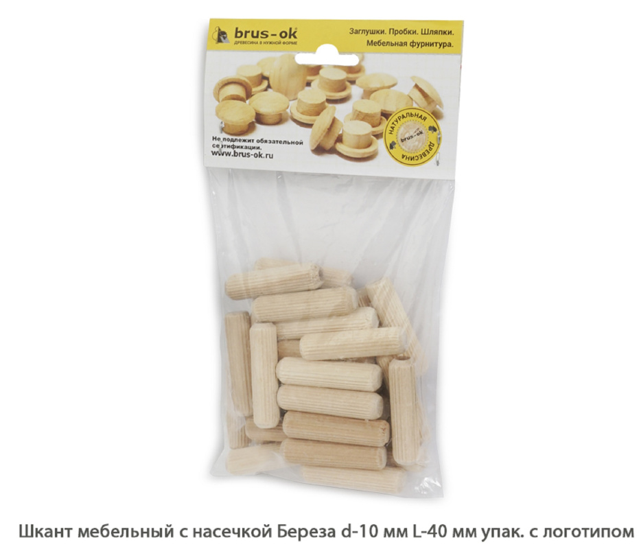 Шканты мебельные с насечкой Береза цельн.массив / упак.логотип (Ø 10 / L 40 мм / упак.30 шт)