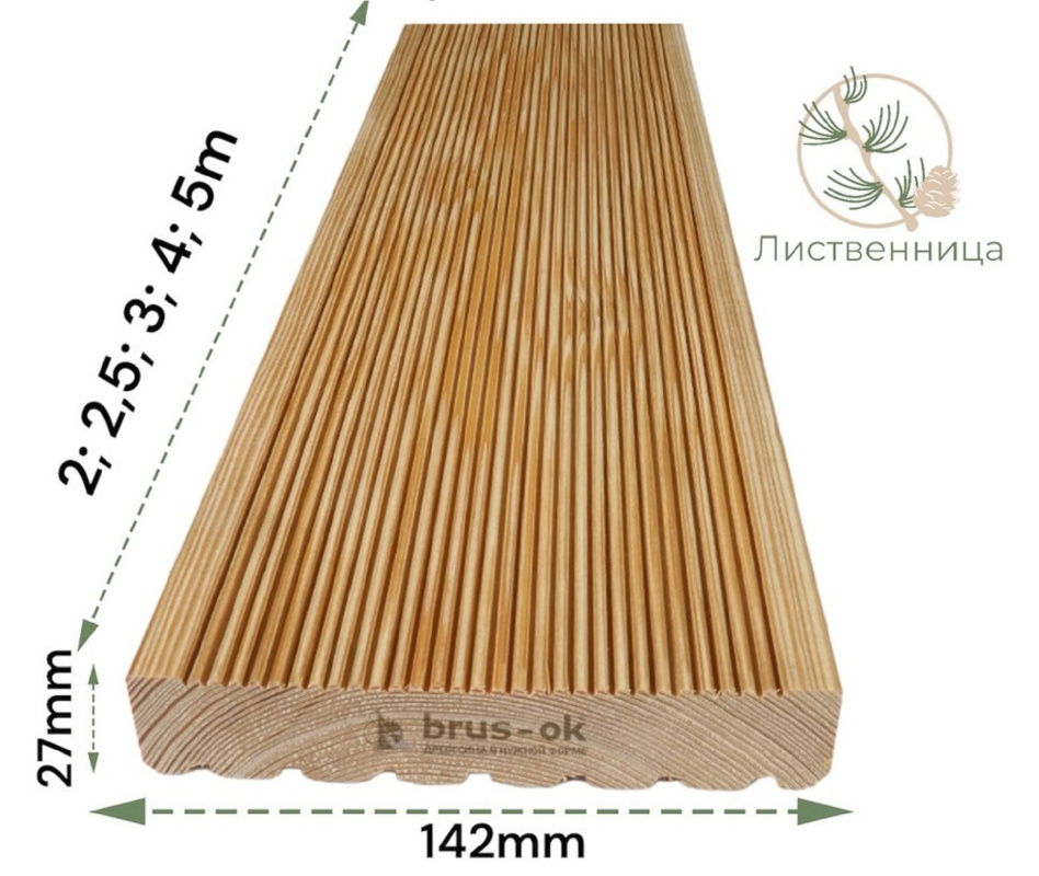 Террасная доска сорт С - допускается наличие здоровых сучков. Террасная доска из лиственницы обладает следующими преимуществами:1. Устойчивость к влаге, к образованию плесени и гниению: лиственница не только не боится плесени, но и обладает антибактериальными свойствами препятствующими размножению гнилостных бактерий, это делает ее идеальным материалом для открытых площадок.